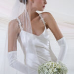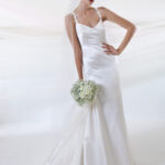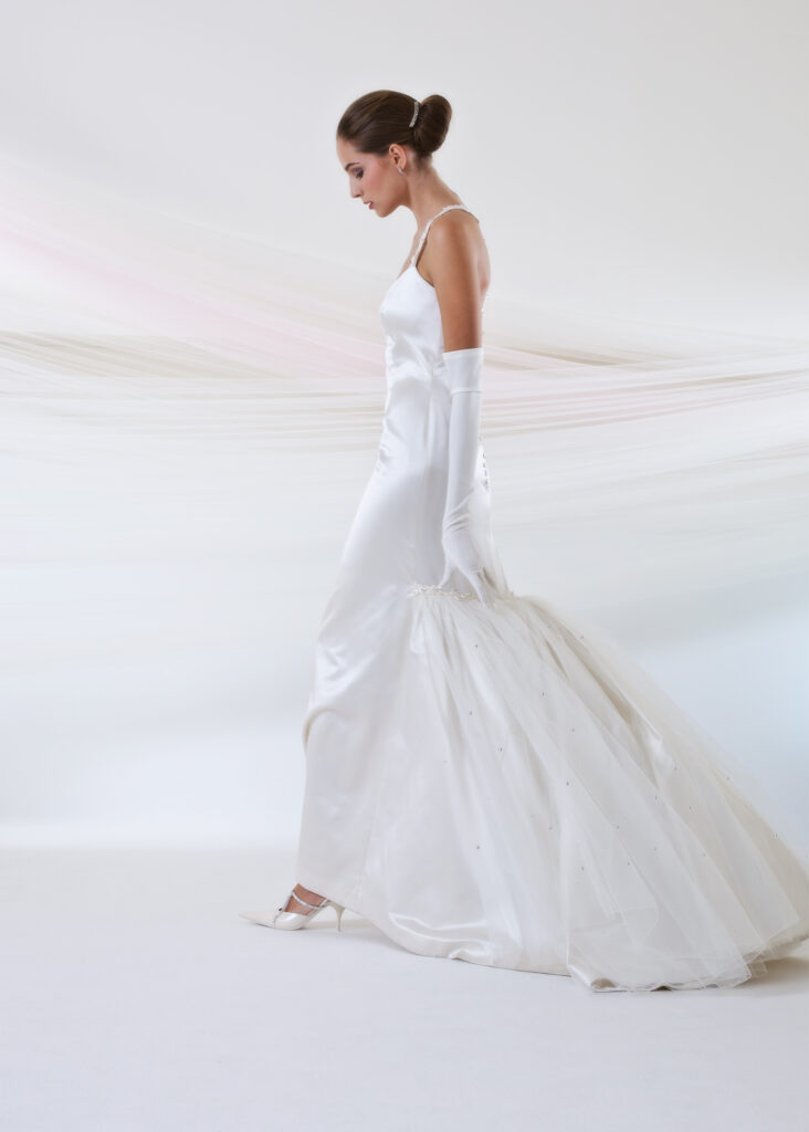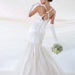 Abito in duchesse di seta pura dalla silhouette sofisticata e dalla profonda scollatura sulla schiena.