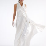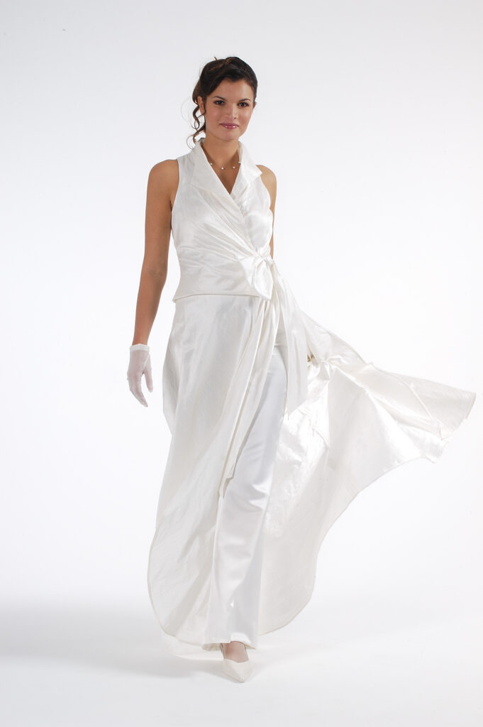 Per una sposa fuori dagli schemi: chantung indiano di seta abbinato al pantalone in cadì di seta. Completa la linea una sopragonna dal taglio asimmetrico sempre in chantung.