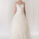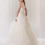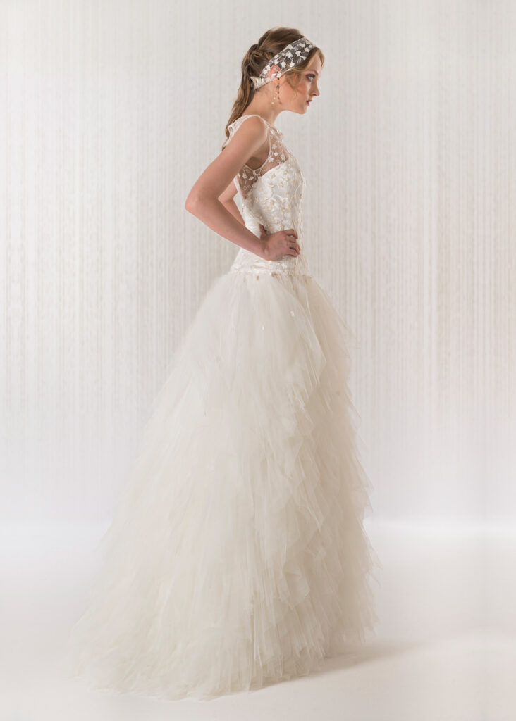 Spumeggiante tulle montato a mano ad onde per questa gonna dalla linea conica abbinata al tulle ricamato con gigli delicati. Pizzi a scelta.