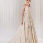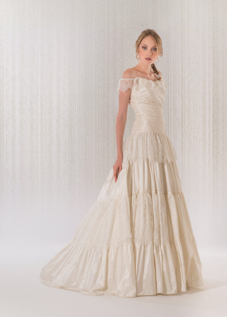 Taffettà di seta pura e pizzo chantilly per adornare la gonna romantica e la sofisticata scollatura che lascia le spalle scoperte.